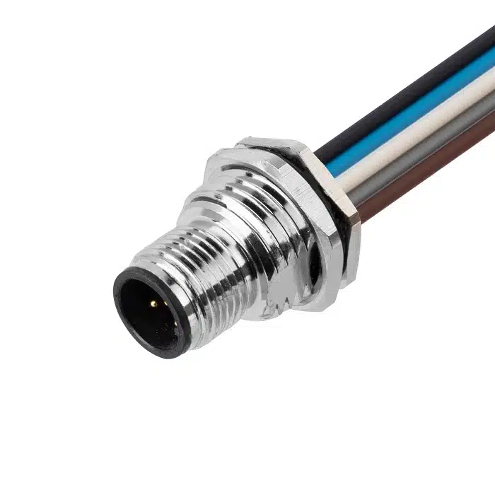 M12 A code Male Straight Panel front mount, rear fastened solder contacts Connector